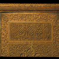 The woodwork bears references to various other woodworks: a similar panel is found on the fragmentarily preserved cenotaph of Saif ad-Din Bakharzi in Bukhara (in the database), while the eastern door to the ziyarat-khaneh of the Qutham b. Abbas complex in Samarkand (in the database) features an almost identical inscription panel in its upper section. The ornament of the main field of the panel—intersecting 12-sided figures—is documented on a wood fragment that was auctioned at Christie's London on April 16, 1986.